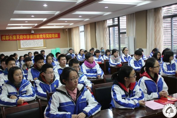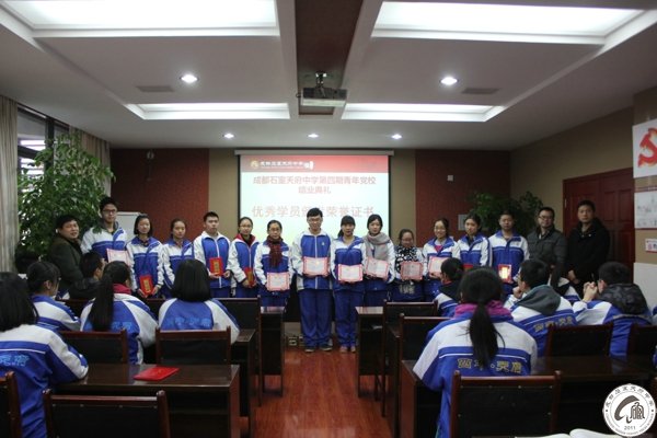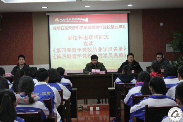 2014年12月15日下午,成都石室天府中学第四期青年党校结业典礼在A教一楼会议室隆重举行。学校副校长谌瑞华同志、校党委副书记刘畅同志、国际部主任唐宇逸同志、德育处主任余定华同志参会,会议由校团委书记廖洪强主持。
