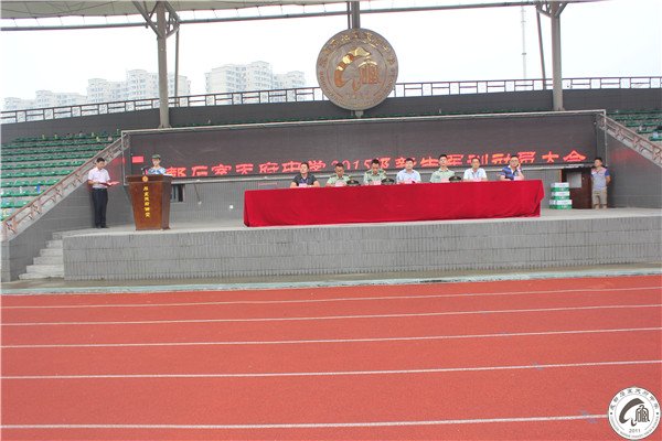八月的骄阳最为灿烂,八月的热情最为高涨。2015年8月24日上午8时30分,我校2015级新生军训动员大会在学校体育场隆重举行,副校长谌瑞华及德育处相关领导,武警警官学院军训营康懿参谋长、卢辰航连长、刘勇勤指导员参加了动员大会。