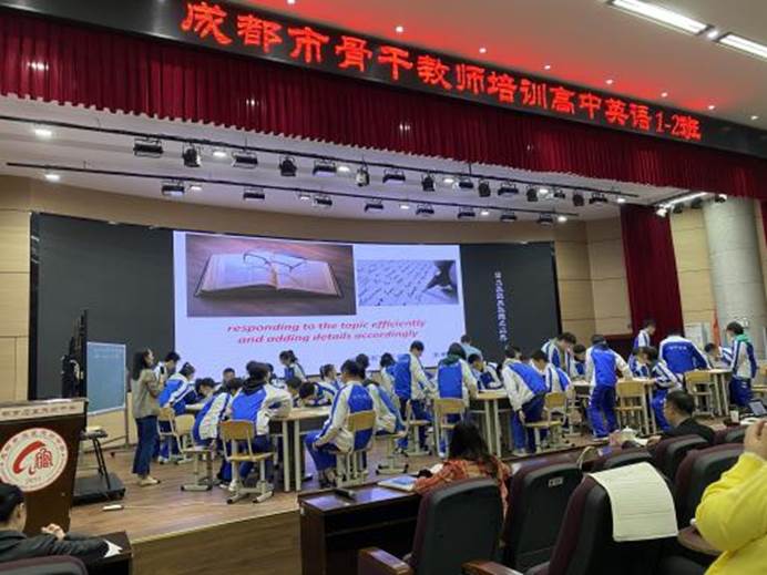 2020年11月11日上午,成都市骨干教师培训进来到(我校)石室天府中学进行一天的跟岗培训,我校高中英语教师有幸也参加了该活动。我校年青教师王欢老师为骨干教师培训班的老师们献上一堂精心打造的作文教学研讨课。在整个培训活动中,上午由来自成都七中李晓东老师为老师们做了《高中英语写作教学探究――以FRIED过程性教学模式为例》的讲座。李晓东老师从他独特的理解和教学中总结出了这五个字母的内涵:F——Finding(finding out thepoints), R—— Reorganizing(reorganizing and organizing the structure,Interesting(interesting words,sentences & contents),E——Editing(editing and revising if necessary), D—— Designing(design your handwritingand the layout of your answer sheet)。
